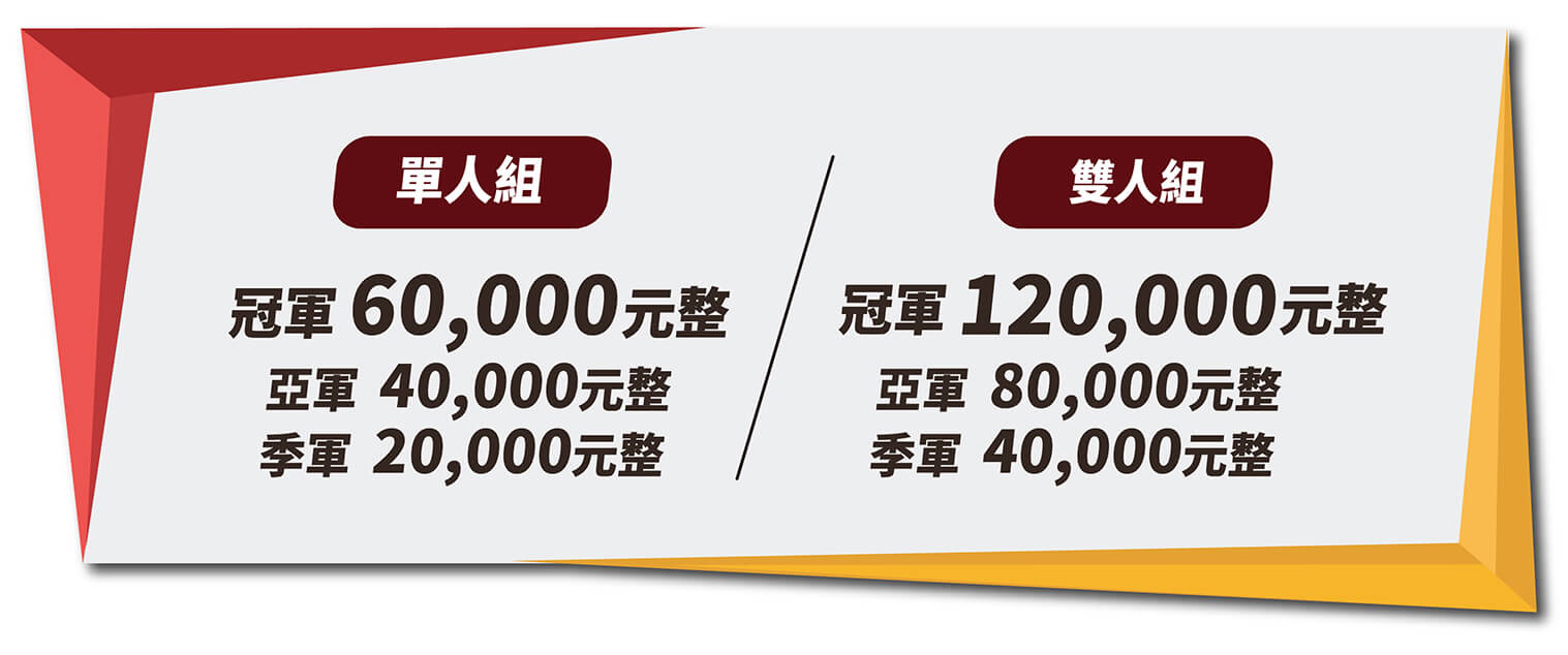 - 雙人組得獎者獎金採均分方式,如有異議請自行提供獎金分配協議書正本給主辦單位進行得獎扣繳及匯款作業。